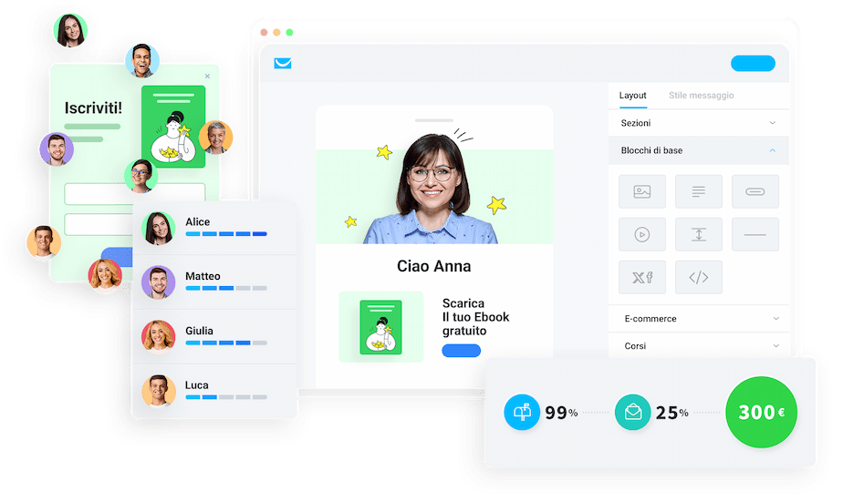 - Costruisci relazioni solide con i tuoi iscritti Invia newsletter personalizzate, attiva autoresponder e crea contenuti con l'AI.