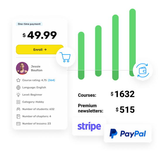 Straightforward PayPal & Stripe integrations make buying your content easy and secure for you and your customers.